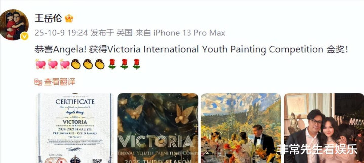 10月9日,两人几乎同时在微博发文,恭喜女儿王诗龄获得“Victoria International Youth Painting Competition”金奖。