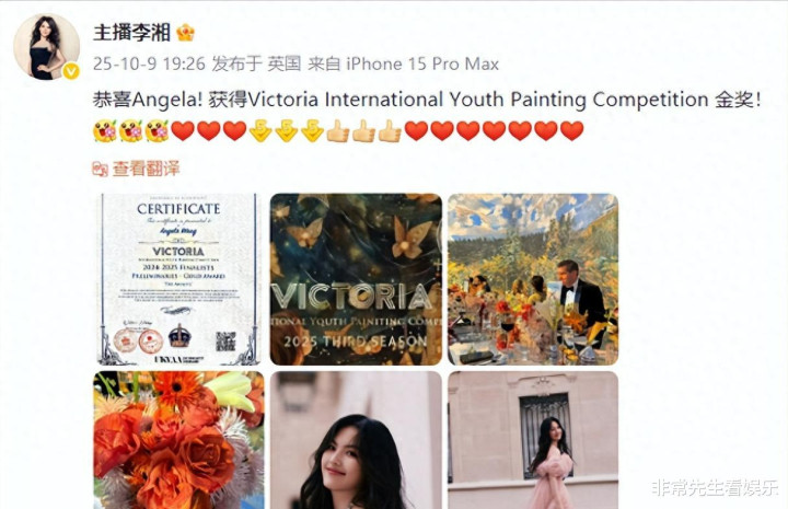 文字一模一样,都是“恭喜Angela!获得Victoria International Youth Painting Competition金奖”,还附上了获奖证书。